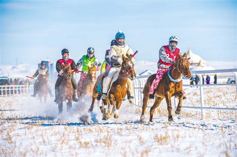 1月18日,錫林浩特市那達(dá)慕風(fēng)情園內(nèi)馬蹄踏雪、人聲鼎沸,“歌游內(nèi)蒙古·暢享錫林浩特”——冬季那達(dá)慕暨蒙古馬超級(jí)聯(lián)賽在歡騰的歌聲中拉開序幕。開幕式上,隨著馬蹄的噠噠聲,一支雄壯的馬隊(duì)踏雪而來,騎手們身著艷麗的蒙古袍,駕馭著矯健的蒙古馬,以整齊的隊(duì)列自遠(yuǎn)處緩緩走來。歌聲悠揚(yáng),舞姿豪邁,演員們以動(dòng)人的演繹,完美詮釋了力量與藝術(shù)之美。本次賽事包含15公里耐力賽、10公里3人團(tuán)體接力賽、跑馬射箭、跑馬拾哈達(dá)、6公里走馬及搏克比賽等比賽項(xiàng)目。賽場(chǎng)上,騎手們馭馬飛馳,人與馬默契配合,在銀裝素裹的雪原上縱橫馳騁。在跑馬射箭與跑馬拾哈達(dá)項(xiàng)目上,騎手在飛奔的馬匹上挽弓搭箭、俯身拾物,動(dòng)作行云流水,精湛技藝引來觀眾陣陣驚呼與贊嘆。除了扣人心弦的比賽,本次活動(dòng)還為游客打造了豐富的冰雪互動(dòng)體驗(yàn)。冰雪涮肉宴香氣四溢,草原篝火電音派對(duì)將熱情推向高潮,千人雪戰(zhàn)、雪地拔河等趣味項(xiàng)目讓游客親身參與,盡情享受冰雪樂趣?,F(xiàn)場(chǎng)還同步舉辦了錫林浩特“伊德喜”草原冬儲(chǔ)肉展銷活動(dòng),讓游客在觀賽之余,還能選購到正宗錫林郭勒牛羊肉,體驗(yàn)純正的草原風(fēng)味。(記者