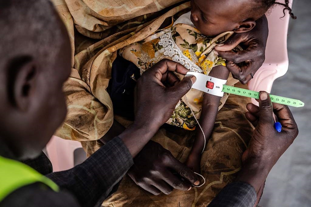 當(dāng)?shù)貢r(shí)間2024年2月13日,南蘇丹,在難民中轉(zhuǎn)中心的診所里,一名醫(yī)護(hù)工作人員在測(cè)量一名蘇丹兒童的手臂周長。