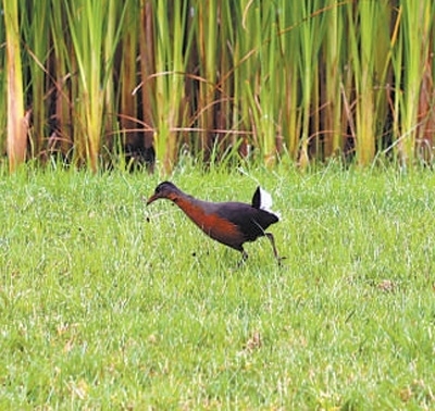 一只正在友誼廣場覓食的魯氏秧雞。 本報記者 沈小曉攝