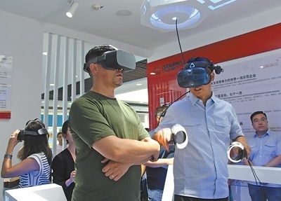 國際青年代表在玉門風電場VR電力安全生產(chǎn)實訓室體驗。 圖為本報記者趙帥杰攝