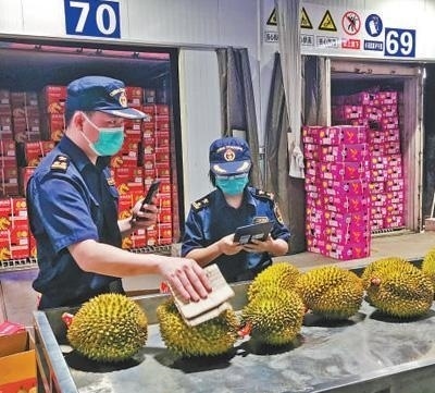 2024年8月1日,在廣西憑祥友誼關(guān)口岸海關(guān)查驗(yàn)平臺,工作人員在查驗(yàn)一批進(jìn)口榴蓮。本報(bào)記者 牛 震攝