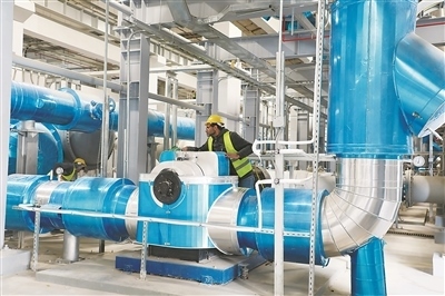 埃及新行政首都中央商務區(qū)項目能源中心設置的變頻空調水泵,為空調系統(tǒng)循環(huán)提供動力,通過變頻調節(jié)實現(xiàn)節(jié)省電能的目的。圖為工作人員對水泵進行檢查和維護。