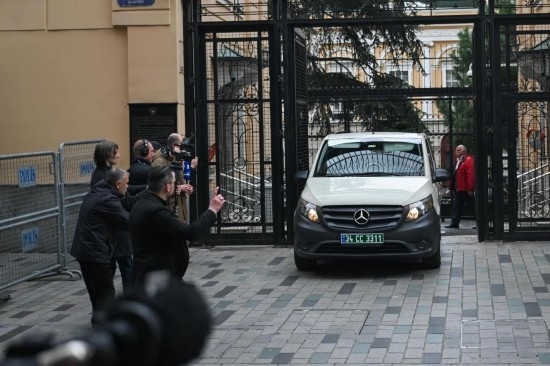 4月10日,在土耳其伊斯坦布爾,載有美國代表的車輛駛離俄羅斯駐伊斯坦布爾總領館。新華社記者劉磊攝