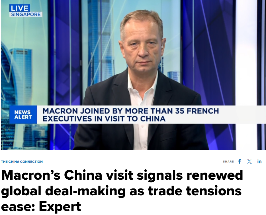 近日,法國(guó)總統(tǒng)馬克龍的訪(fǎng)華之行引發(fā)國(guó)際社會(huì)廣泛關(guān)注。美國(guó)消費(fèi)者新聞與商業(yè)頻道(CNBC)采訪(fǎng)專(zhuān)家指出,這一中法重要外交活動(dòng)標(biāo)志著全球貿(mào)易緊張局勢(shì)的緩和,意味著一度受阻的全球貿(mào)易談判重回正軌,為國(guó)際經(jīng)貿(mào)合作注入新的活力。