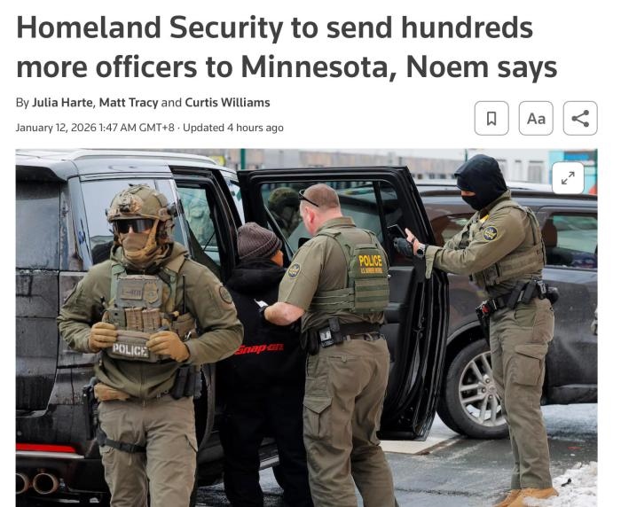 報道稱,此前已有約2000名聯(lián)邦警員被派往明尼阿波利斯-圣保羅地區(qū),這是國土安全部有史以來規(guī)模最大的行動。