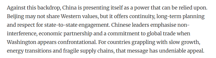 文章認為,在此背景下,中國是可靠力量。中國提供了連續(xù)性、長期規(guī)劃和尊重國家間的交流。中國強調(diào)不干涉、經(jīng)濟伙伴關(guān)系和對維護全球貿(mào)易。對于那些正面臨增長緩慢、能源轉(zhuǎn)型和供應(yīng)鏈脆弱的國家來說,這一主張具有不可否認的吸引力。另外,中國與美國不同,中國并不要求合作時必須實現(xiàn)意識形態(tài)上的一致性。中國提供市場、投資和交流。在不確定的時代,這些反而更體現(xiàn)了一種穩(wěn)定。