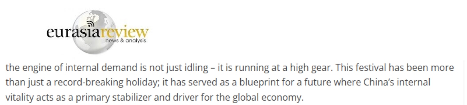 文章最后說,春節(jié)消費熱潮表明,內需引擎非但沒有空轉,反而在高速運轉。這個春節(jié)的意義不僅僅在于其破紀錄的假期數據,而是在于它繪制了一幅未來藍圖:中國的內在活力將成為全球經濟的主要穩(wěn)定器和驅動力。
