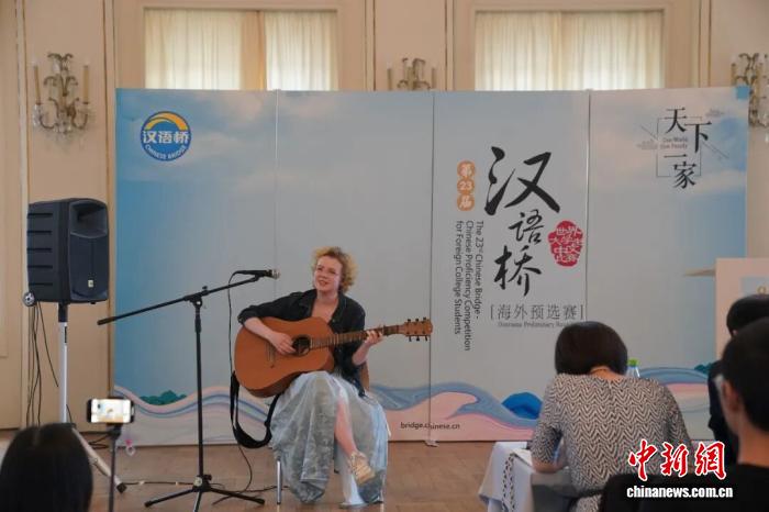 2024年5月25日,第二十三屆“漢語橋”世界大學生中文比賽德國區(qū)決賽在萊比錫舉行。圖為特等獎得主李歡欣(Ann-Christin Otte)在比賽中展示才藝。中新社記者 馬秀秀 攝