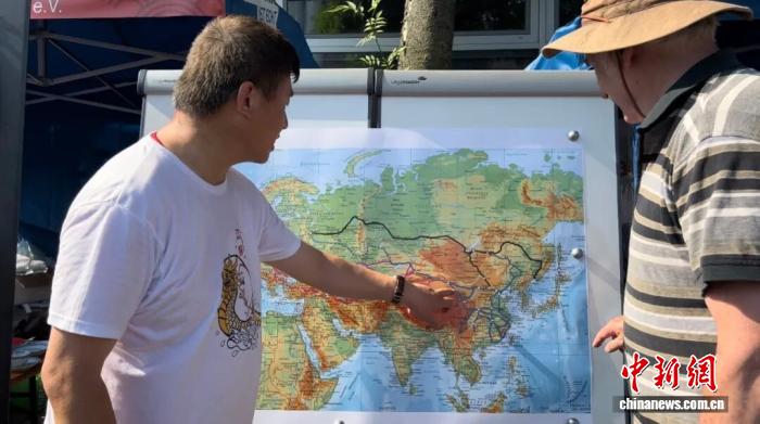 2023年6月11日,德國民眾沃爾夫岡·卡利施克在德國杜伊斯堡趣味龍舟賽上了解中歐班列線路圖。中新社記者 馬秀秀 攝