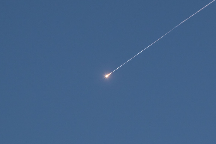 3月17日,在耶路撒冷上空,以軍防空攔截彈擊中導(dǎo)彈,導(dǎo)彈碎片落下。新華社記者陳君清攝