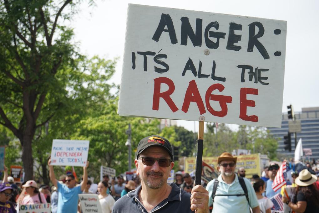 3月28日,人們?cè)诿绹?guó)加利福尼亞州洛杉磯參加“不要國(guó)王”抗議活動(dòng)。新華社發(fā)(曾慧攝)
