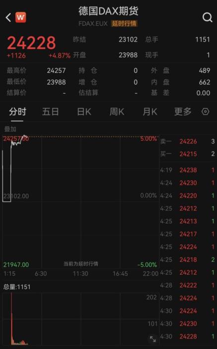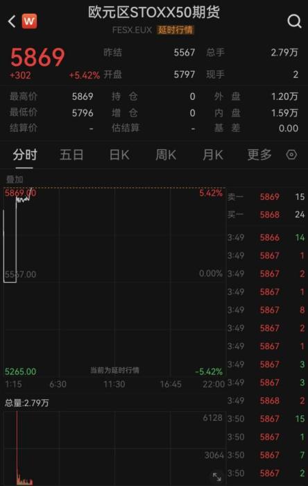 歐美市場(chǎng)期貨同步上漲,歐元區(qū)斯托克50指數(shù)期貨上漲超5.5%,德國(guó)DAX期貨最高漲超5%。美股三大指數(shù)期貨均漲超2%,其中納斯達(dá)克100期貨小型最多漲超3%。