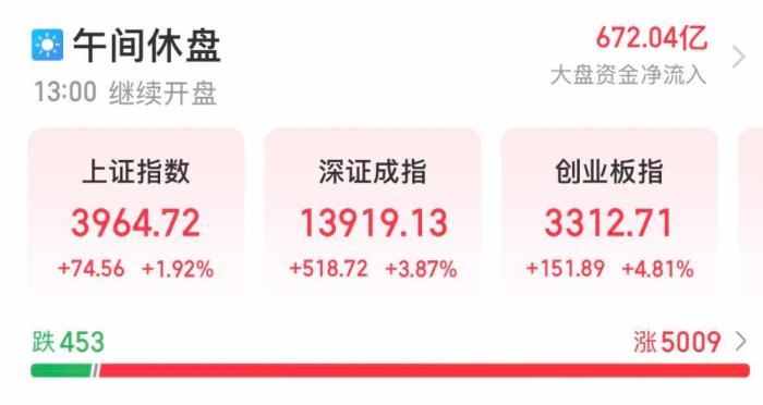 受投資者情緒提振,亞洲股市今早開(kāi)盤(pán)后同步暴漲。午間休盤(pán),A股三大股指仍全部上漲,上證指數(shù)最高漲近2%,深證成指最高漲幅達(dá)3.87%,創(chuàng)業(yè)板指數(shù)漲4.81%。午間休盤(pán)前,股市中仍有超5000只個(gè)股上漲。