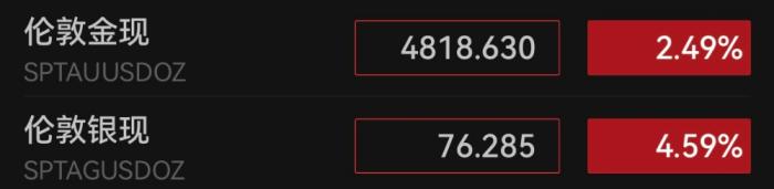 國(guó)際貴金屬市場(chǎng)并未因?;鹣⒍禍?,反而顯著走高。截至8日13:00,倫敦金現(xiàn)盤(pán)中大漲超過(guò)3%,再度漲超4850美元/盎司;國(guó)際銀價(jià)大漲,倫敦銀現(xiàn)盤(pán)中漲幅近6%,突破77美元/盎司。