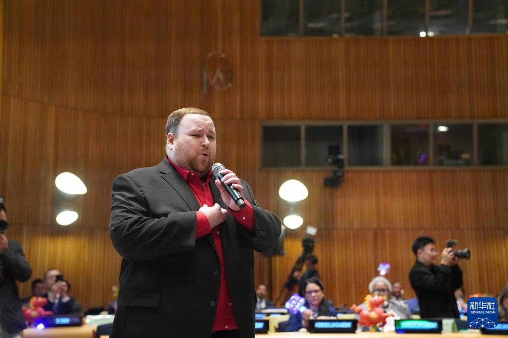 4月13日,在位于紐約的聯(lián)合國總部,美國歌唱家在聯(lián)合國中文日慶?;顒由涎莩段覑勰阒袊?。 新華社記者 張鳳國 攝