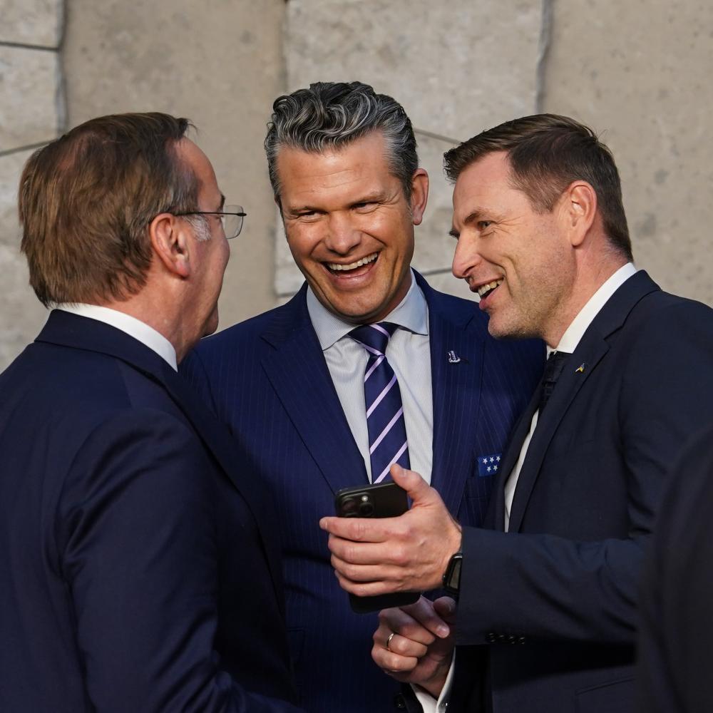 2025年10月15日,在比利時(shí)布魯塞爾舉行的北約防長會(huì)議結(jié)束后,美國國防部長赫格塞思(中)與愛沙尼亞國防部長佩夫庫爾(右)、德國國防部長皮斯托里烏斯交談。新華社記者彭子洋攝