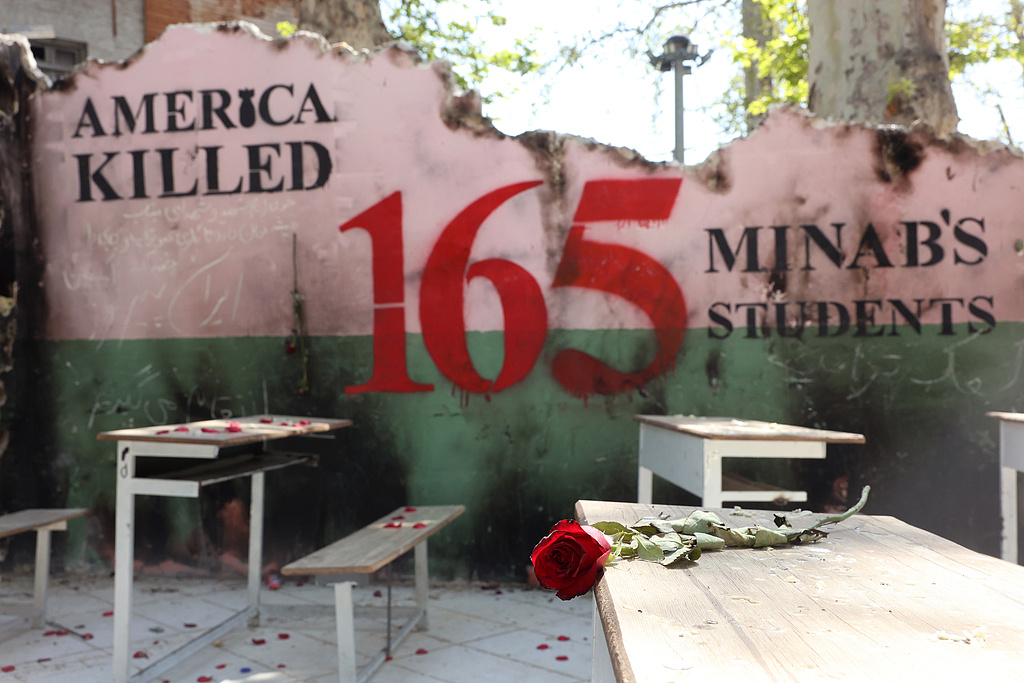 △伊朗德黑蘭北部,一朵花被放置在象征米納卜學(xué)校的紀(jì)念處(資料圖)