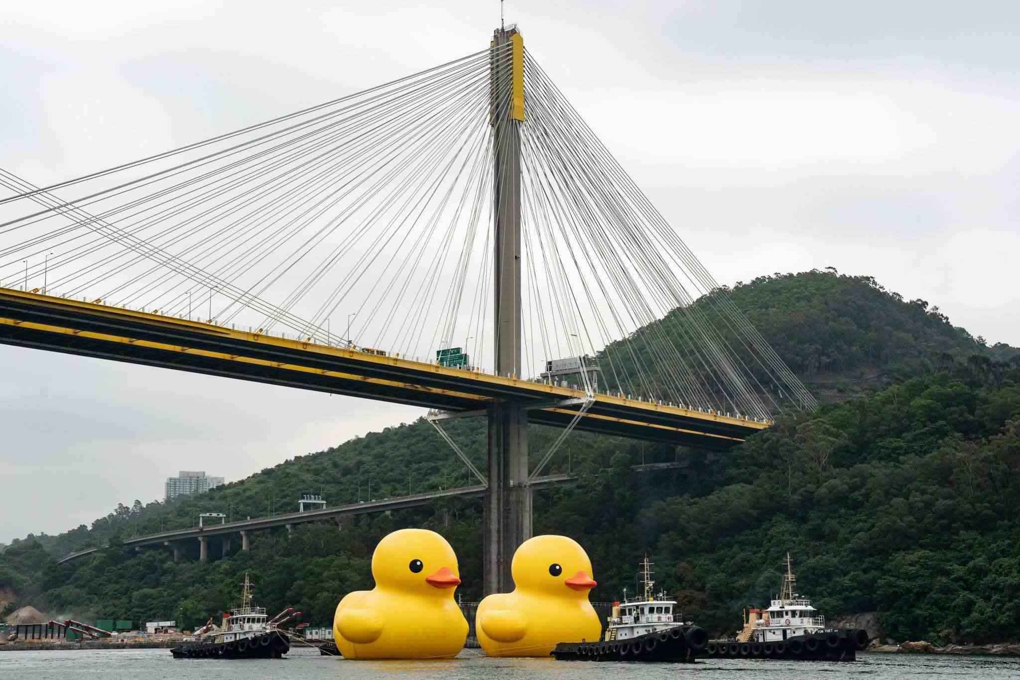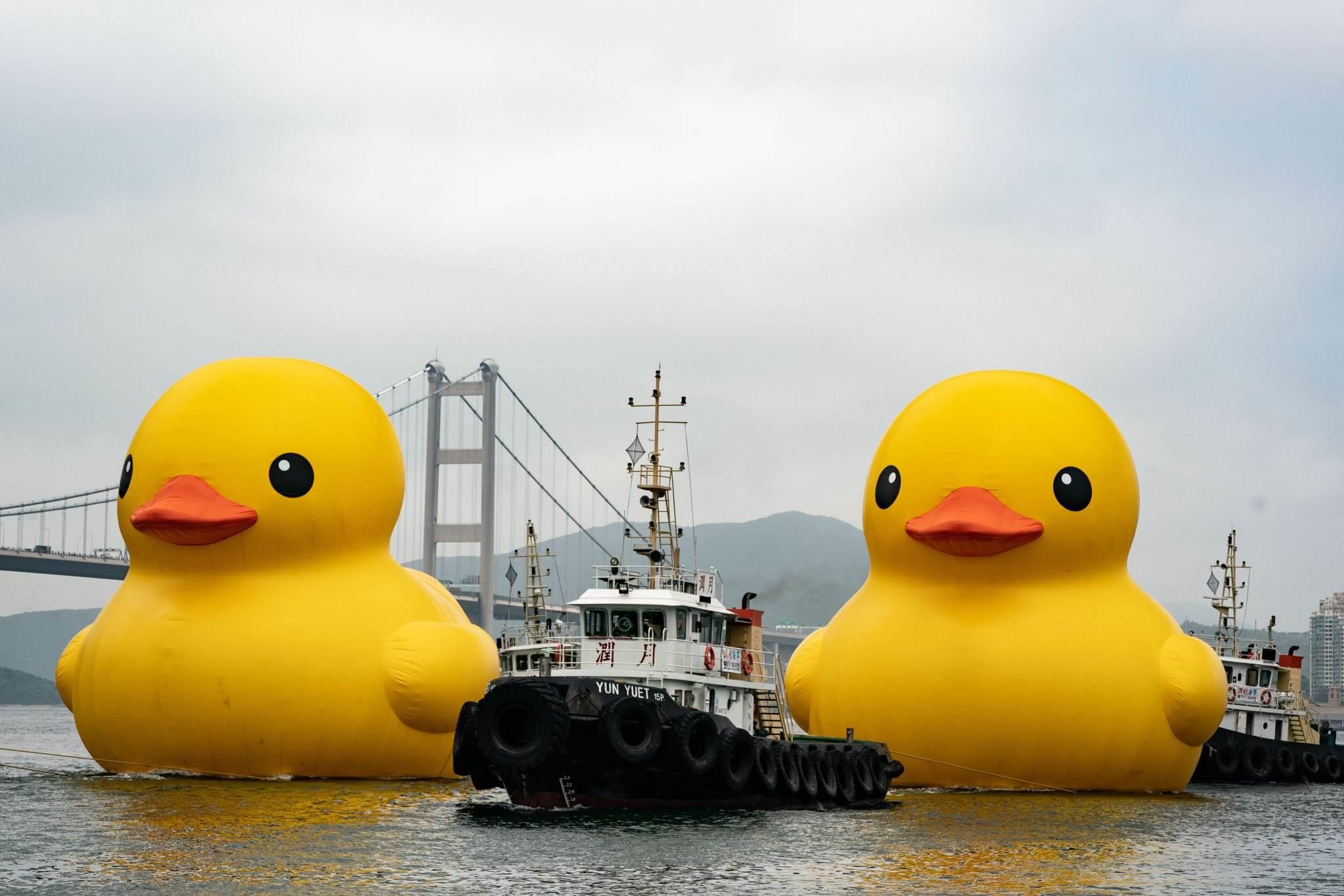 2023年5月25日,香港,兩只18米高的巨型橡皮鴨現身于青衣海域,引市民關注。視覺中國