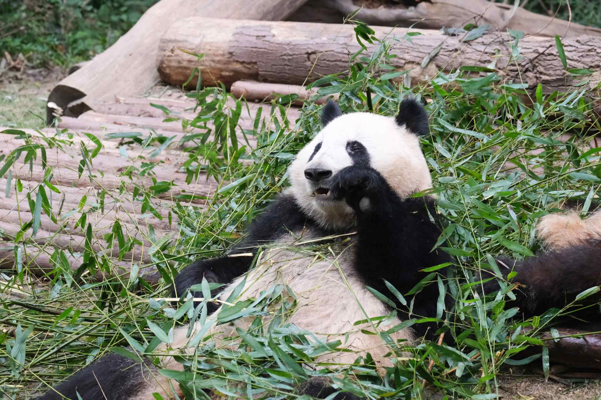 成都:大熊貓和花和葉姐弟早起吃竹子