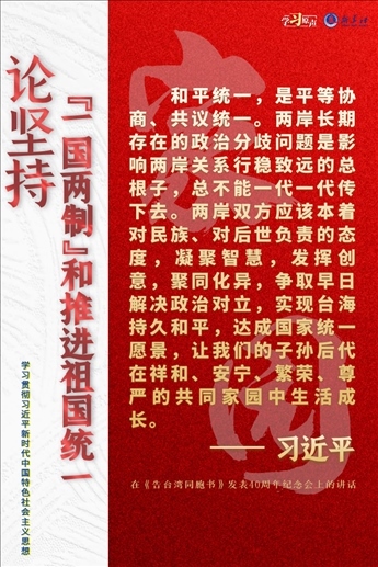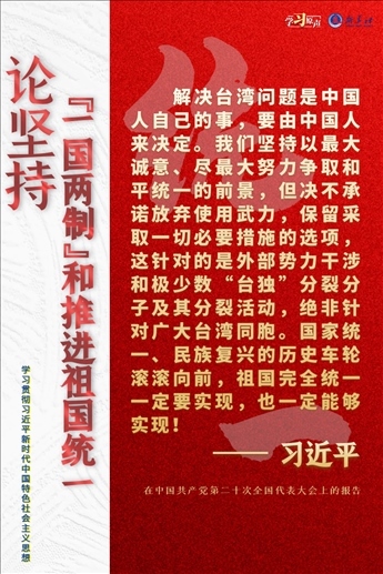 解決臺灣問題、實現(xiàn)祖國完全統(tǒng)一,是中國共產(chǎn)黨矢志不渝的歷史任務(wù),是全體中華兒女的共同愿望,是實現(xiàn)中華民族偉大復興的必然要求。必須堅持貫徹新時代黨解決臺灣問題的總體方略,牢牢把握兩岸關(guān)系主導權(quán)和主動權(quán),堅定不移推進祖國統(tǒng)一大業(yè)。
