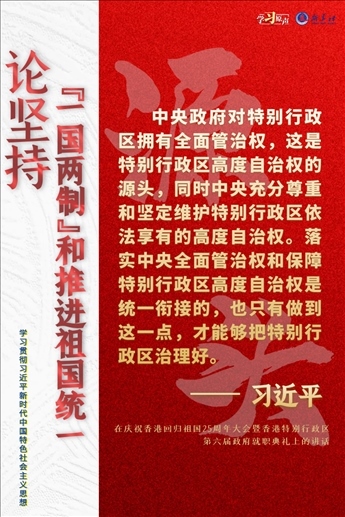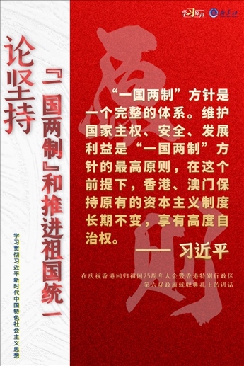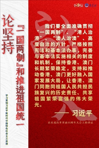 “一國兩制”是黨領(lǐng)導人民實現(xiàn)祖國和平統(tǒng)一的一項重要制度,是國家的一項基本國策。中國特色社會主義進入了新時代,意味著“一國兩制”事業(yè)也進入了新時代。不斷推進“一國兩制”在香港、澳門的成功實踐,是中華民族偉大復興歷史進程的重要組成部分。