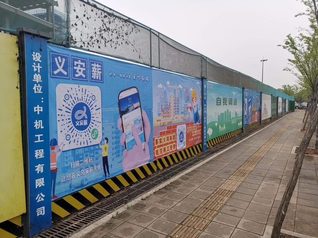 義烏市一在建工地圍擋上粘貼的“義安薪”勞資糾紛維權(quán)碼。(義烏市人社局供圖)