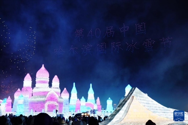 1月5日,在哈爾濱冰雪大世界園區(qū),游客在觀看哈爾濱國際冰雪節(jié)開幕式上的無人機表演。當(dāng)日,第40屆中國·哈爾濱國際冰雪節(jié)開幕,吸引眾多游客。新華社記者 王建威 攝