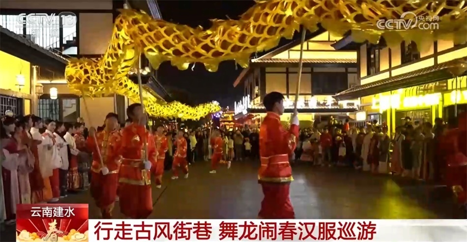 在云南紅河州建水縣紫陶里漢唐街區(qū),一場(chǎng)舞龍鬧春漢服巡游活動(dòng)拉開(kāi)了序幕。舞龍隊(duì)伍一路閃轉(zhuǎn)騰挪,一條黃色長(zhǎng)龍奮力舞動(dòng),忽高忽低,飄忽飛逸。身著華美漢服的姑娘行走在古風(fēng)街巷間,一種古樸幽遠(yuǎn)的韻味撲面而來(lái)。市民與游客在感受建水年味的同時(shí),也體驗(yàn)到中華傳統(tǒng)文化之美。