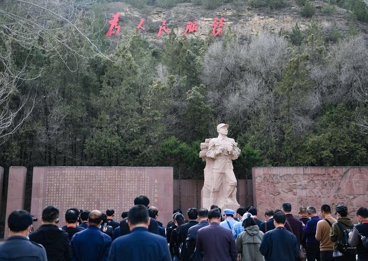 參觀者在延安棗園《為人民服務》講話紀念廣場參觀。新華社記者 張博文 攝