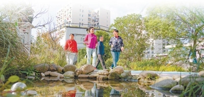 市民在長(zhǎng)寧區(qū)北新涇街道新涇五村花園散步。