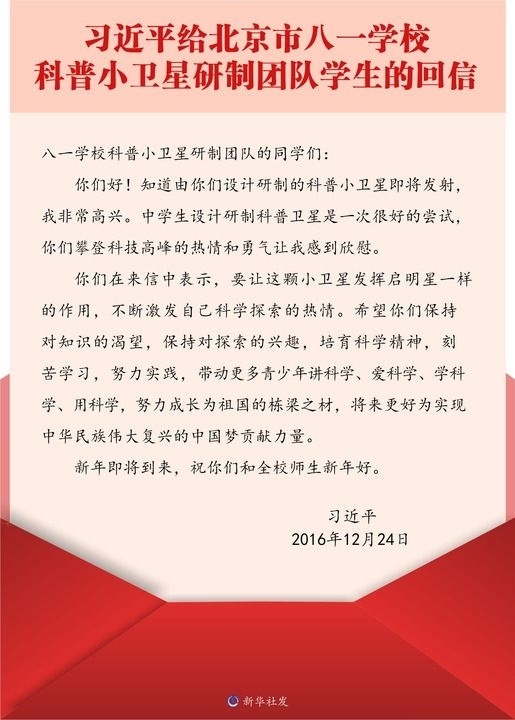 三個(gè)多月后,同學(xué)們給習(xí)近平總書記寫信,報(bào)告小衛(wèi)星即將發(fā)射的消息,很快收到了總書記的回信。習(xí)近平總書記在回信中說,“你們攀登科技高峰的熱情和勇氣讓我感到欣慰”“希望你們保持對(duì)知識(shí)的渴望,保持對(duì)探索的興趣,培育科學(xué)精神,刻苦學(xué)習(xí),努力實(shí)踐,帶動(dòng)更多青少年講科學(xué)、愛科學(xué)、學(xué)科學(xué)、用科學(xué),努力成長為祖國的棟梁之材”。