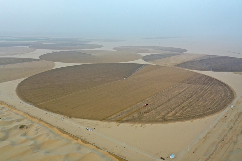 在新疆和田地區(qū)策勒縣4萬畝苜蓿種植基地,農(nóng)機(jī)手駕駛機(jī)械在播種苜蓿(9月9日攝,無人機(jī)照片)。