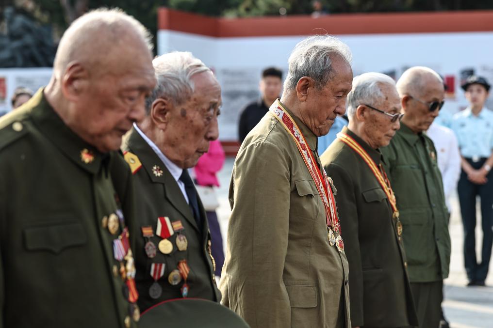 9月10日,抗美援朝老戰(zhàn)士在祭奠活動(dòng)中默哀,左三為老戰(zhàn)士南啟祥。新華社記者潘昱龍 攝