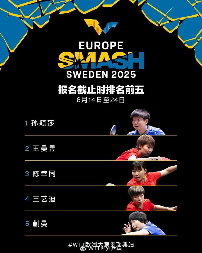 女單方面,報名截止時排名前五的運(yùn)動員均為中國隊(duì)選手,她們是孫穎莎、王曼昱、陳幸同、王藝迪和蒯曼。國乒隊(duì)員石洵瑤、錢天一、陳熠也將出戰(zhàn)。其他協(xié)會名將包括日本的張本美和、伊藤美誠、大藤沙月和早田希娜,以及韓國的申裕斌。