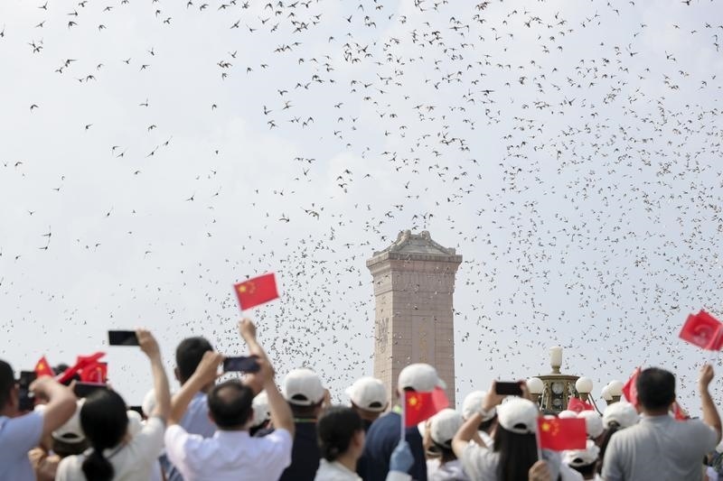 9月3日,紀念中國人民抗日戰(zhàn)爭暨世界反法西斯戰(zhàn)爭勝利80周年大會在北京隆重舉行。這是紀念大會現(xiàn)場放飛鴿子。