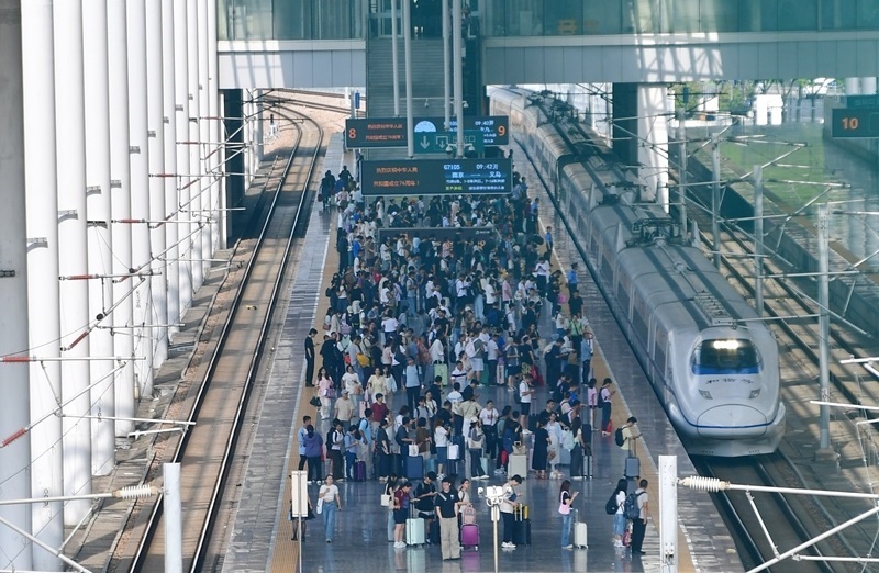 10月8日,旅客在江蘇無(wú)錫火車(chē)站站臺(tái)乘車(chē)。