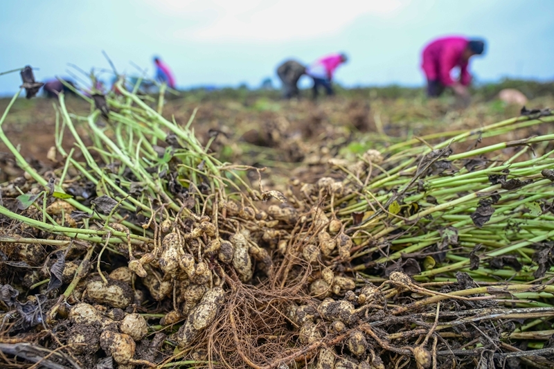 10月11日,河南省洛陽市瀍河區(qū)白馬寺鎮(zhèn)翟泉村農民在收獲花生。