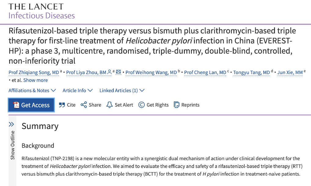 北京大學(xué)第三醫(yī)院消化科周麗雅、宋志強(qiáng)教授團(tuán)隊帶領(lǐng)全國40家醫(yī)療機(jī)構(gòu)消化疾病診療中心,通過全球首個Ⅲ期臨床試驗,證實了含利福特尼唑的三聯(lián)方案,比臨床上常用的鉍劑四聯(lián)方案具有更高的根除成功率和更低的不良反應(yīng)發(fā)生率,而且用藥更少,服用更方便,將為全球幽門螺桿菌感染者帶來了全新的治療選擇。相關(guān)成果日前于《柳葉刀-感染病學(xué)》在線發(fā)表。