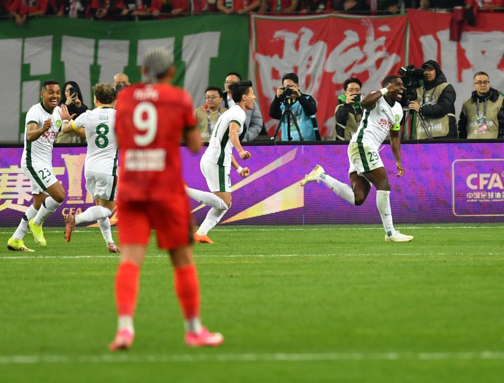 12月6日,北京國安隊(duì)球員法比奧(右一)在比賽中慶祝進(jìn)球。新華社記者 李嘉南 攝