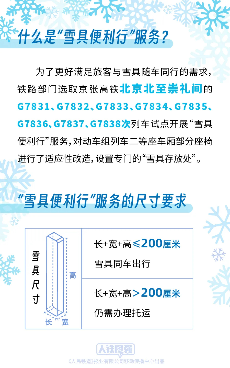 鐵路部門堅(jiān)持以人民為中心的發(fā)展思想,持續(xù)深化運(yùn)輸供給側(cè)結(jié)構(gòu)性改革,積極適應(yīng)旅客多樣化的出行需求,為攜帶雪具出行的旅客提供便捷服務(wù)。前期,鐵路部門按照《國鐵集團(tuán)鐵路旅客運(yùn)輸規(guī)程》“旅客乘坐動(dòng)車組列車隨身攜帶的行李物品長、寬、高之和不超過130厘米”的規(guī)定,對(duì)超過上述尺寸標(biāo)準(zhǔn)的雪具推出了“雪具快運(yùn)”服務(wù)。為了更好滿足旅客與雪具隨車同行的需求,鐵路部門統(tǒng)籌考慮旅客安全、乘車秩序和雪具運(yùn)輸需求,選取京張高鐵北京北至崇禮間的G7831、G7832、G7833、G7834、G7835、G7836、G7837、G7838次列車試點(diǎn)開展“雪具便利行”服務(wù),對(duì)動(dòng)車組列車二等座車廂部分座椅進(jìn)行了適應(yīng)性改造,設(shè)置專門的“雪具存放處”,旅客選擇該服務(wù)后可攜帶長、寬、高之和不超過200厘米的雪具同車出行,滑雪更加方便快捷。對(duì)于長、寬、高之和超過200厘米的雪具,由于高鐵列車車內(nèi)空間限制,仍需辦理托運(yùn)。