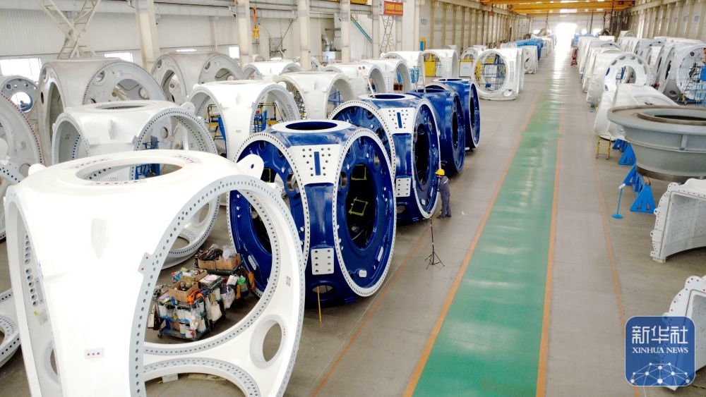 ↑ 12月15日,工人在山東省濱州市惠民經(jīng)濟(jì)開(kāi)發(fā)區(qū)風(fēng)電裝備產(chǎn)業(yè)園的車(chē)間清理風(fēng)電輪轂(無(wú)人機(jī)照片)。新華社發(fā)(王軍攝)