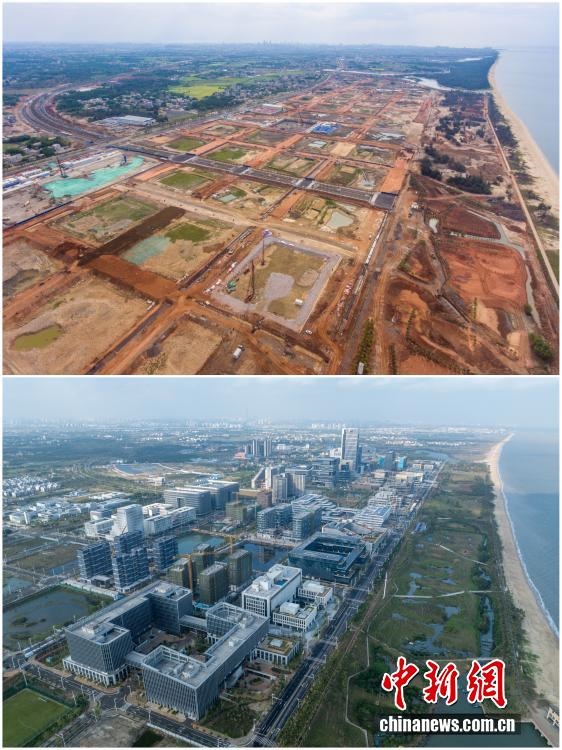 2025年12月18日,海南自由貿易港正式啟動全島封關。近年來,海南自貿港建設在利好政策帶動下不斷刷新“自貿港速度”,一個個重大項目、重點園區(qū)拔地而起,直觀呈現(xiàn)海南自貿港的蓬勃生機。這里正成為中國對外開放的新前沿、互利合作的新熱土和推動經(jīng)濟全球化的新引擎。上資料圖為2020年8月19日俯瞰三亞崖州灣科技城高新區(qū)建設現(xiàn)場,下資料圖為2025年12月9日已初具規(guī)模的三亞崖州灣科技城高新區(qū)。(拼版圖,無人機照片)
