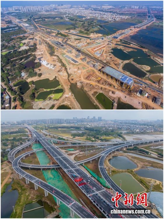 2025年12月18日,海南自由貿易港正式啟動全島封關。近年來,海南自貿港建設在利好政策帶動下不斷刷新“自貿港速度”,一個個重大項目、重點園區(qū)拔地而起,直觀呈現(xiàn)海南自貿港的蓬勃生機。這里正成為中國對外開放的新前沿、互利合作的新熱土和推動經(jīng)濟全球化的新引擎。上資料圖為2021年2月6日正在建設中的G15沈海高速公路??诙雾椖亢P慊ネǎ沦Y料圖為2022年12月28日G15沈海高速公路海口段建成通車。(拼版圖,無人機照片)