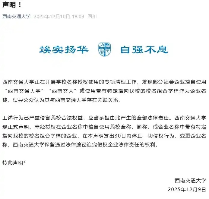 2025年12月10日,西南交通大學(xué)發(fā)表聲明稱,該校正在開展學(xué)校名稱授權(quán)使用的專項(xiàng)清理工作,發(fā)現(xiàn)部分社會(huì)企業(yè)擅自使用“西南交通大學(xué)”“西南交大”或使用帶有特定指向該校的校名組合字樣作為企業(yè)名稱,誤導(dǎo)公眾認(rèn)為其與西南交通大學(xué)存在關(guān)聯(lián)關(guān)系。