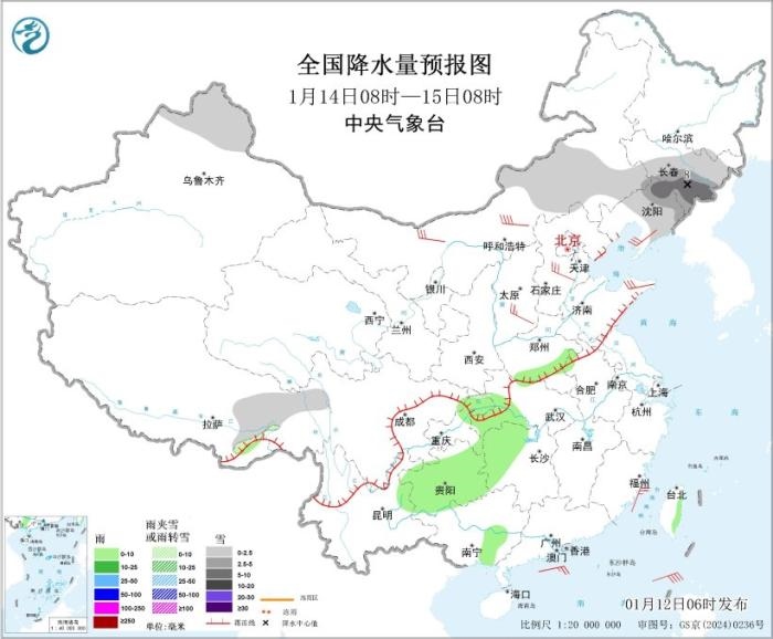 圖4 全國降水量預(yù)報(bào)圖(1月14日08時-15日08時)。圖片來源:中央氣象臺網(wǎng)站