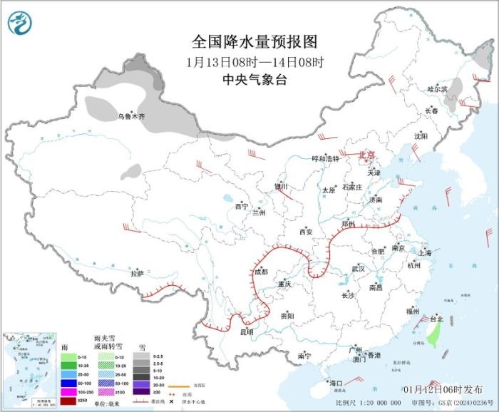 圖2 全國降水量預(yù)報(bào)圖(1月12日08時-13日08時)。圖片來源:中央氣象臺網(wǎng)站
