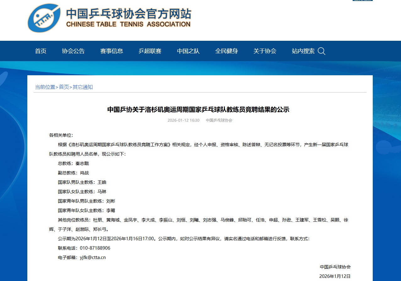 新華社北京1月12日電 中國乒協(xié)官網12日公示洛杉磯奧運周期國家乒乓球隊教練員競聘結果,擬聘秦志戩為總教練、肖戰(zhàn)為副總教練。