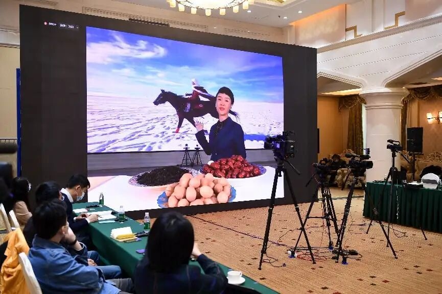 2022年3月17日,新疆維吾爾自治區(qū)人民政府在北京舉辦涉疆新聞發(fā)布會(huì),并在會(huì)上視頻連線賀嬌龍,請(qǐng)她介紹帶領(lǐng)民眾通過(guò)直播帶貨增收的情況。 中新社記者 田雨昊 攝