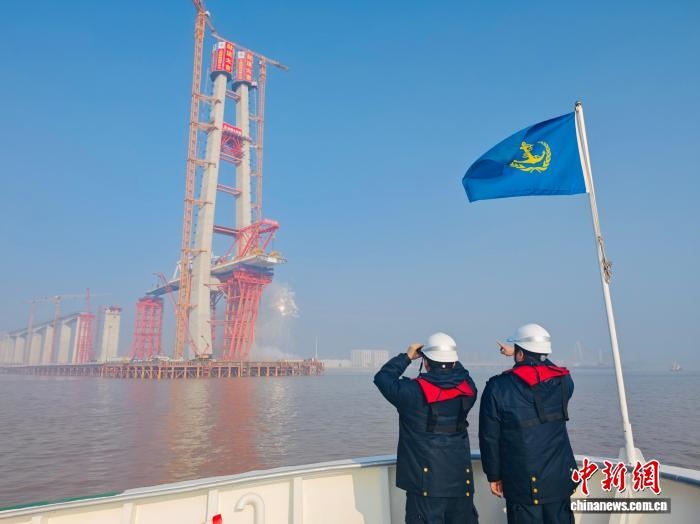 海事部門工作人員現場保障大橋建設。嘉興海事局供圖