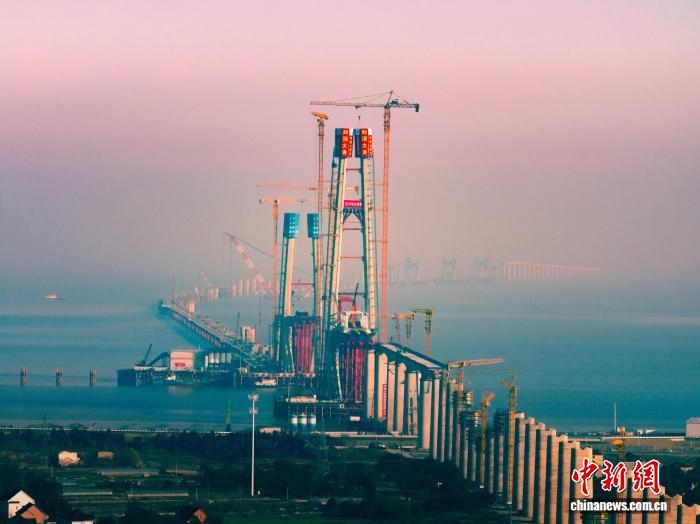 杭州灣跨海鐵路大橋北航道橋8號主塔封頂。嘉興海事局供圖